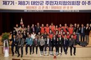 (원투원뉴스) 태안군 주민자치협의회가 26일 태안문화원에서 가세로 군수와 주민자치위원 등 200여 명이 참석한 가운데 제7·8대 회장 이·취임식을 갖고 새 출발을 알렸다. 군은 26일 태안문화원 2층 아트홀에서 주민자치위원들의 노고를 격려하고 자긍심을 높이기 위해 이·취임식을 개최했으며, 행사는 표창장 및 공로패 수여와 협의회기 전수 및 취임사 순으로 진행됐다. 이날 행사에서는 제7대 협의회를 이끌며 주민 참여 확대와 지역공동체 활성화에 기여한 김관래 이임 회장에게 도지사 표창장을 전달했으며 김 회장은 이임사를 통해 그간 소임에 전념할 수 있도록 도와준 위원들과 군민들에게 감사를 전했다. 또한 이임하는 태안읍 전미화 주민자치위원장과 소원면 박정희 주민자치위원장의 그간 노고에 감사의 뜻을 담아 군에서 공로패를 수여했다. 제8대 회장으로 취임한 변영민 신임 회장은 취임사에서 주민들의 작은 목소리에도 귀를 기울여 주민자치를 실현하겠다는 포부를 밝히고 협의회가 지역 현안 해결의 주체로서 역할을 다할 수 있도록 힘쓰겠다고 말했다. 군은 주민자치협의회가 풀뿌리 민주주의의 핵심으로서 군민의 의견을