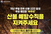 (원투원뉴스) 지난 주말 전국 산불 22건 발생 주요 원인은 '부주의' 산불 예방수칙을 지켜주세요 · 산에서 취사, 흡연 등 금지 · 산 근처에서 쓰레기 소각 금지 · 연기, 불씨 보면 119 신고 "불법소각, 꽁초 투기 등 위반 행위 엄정 대응"