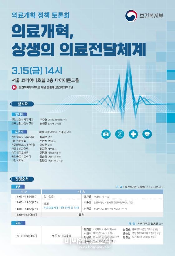 (비씨엔뉴스24) 보건복지부는 3월 15일 오후 2시 서울 코리아나 호텔에서 의료전달체계 개혁 방안 논의를 위한 「의료개혁 정책 토론회」를 개최했다.