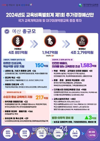 (비씨엔뉴스24) 대구시교육청은 2024년도 제1회 추가경정예산(안)을 기정예산 대비 1,947억 원이 증액된 4조 2,798억 원으로 편성해 5월 30일 대구시의회에 제출한다고 밝혔다.