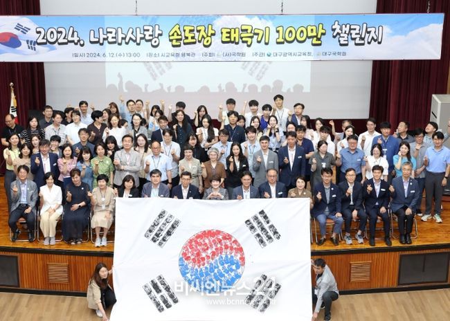 (비씨엔뉴스24) 대구시교육청은 나라사랑 마음과 공동체 의식을 함양하고 일상 속 나라 사랑 실천에 동참하기 위해 6월 12일 13:00 시교육청 행복관에서 강은희 교육감과 교육청 직원이 함께하는 ‘2024. 나라사랑 손도장 태극기 100만 챌린지’를 진행한다.