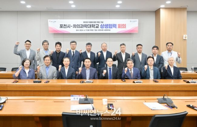 (비씨엔뉴스24) 포천시는 지난 17일 포천시청 시정회의실에서 차원태 차의과학대학교 총장을 비롯한 30명의 관계자가 참석한 가운데, 포천시와 차의과학대학교의 상생발전을 위한 회의를 개최했다.