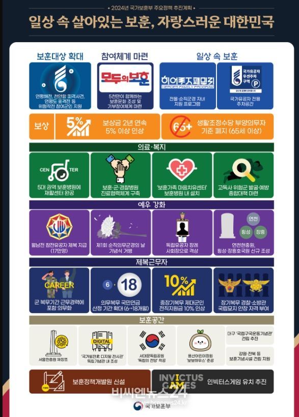 (비씨엔뉴스24) 국가보훈부는 19일, 부(部) 승격 후 첫해인 2024년 정책 방향을 ‘일상 속 살아있는 보훈, 자랑스러운 대한민국’으로 설정하고, 국가보훈의 과거(책임)-현재(존중)-미래(기억)를 아우르는 3대 전략목표, 9개 관리과제를 골자로 한 주요 정책 추진계획을 발표했다.