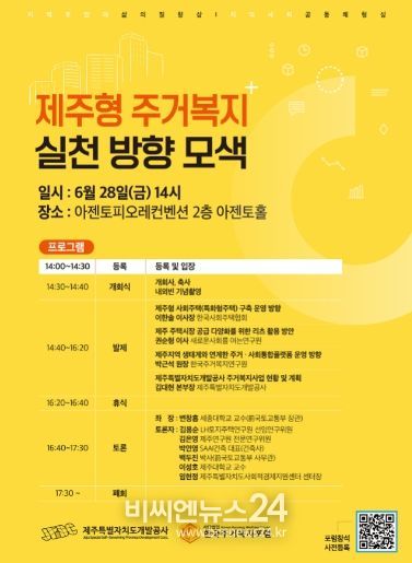 (비씨엔뉴스24) 제주개발공사와 (사)한국주거복지포럼은 “제주형 주거복지 실천 방향 모색”이라는 주제로 주거복지 전문가를 초빙하여 도민과 함께하는 제주 주거복지 포럼을 6월 28일 14시부터 아젠토피오레컨벤션(아젠토홀)에서 공동 개최할 예정이다.