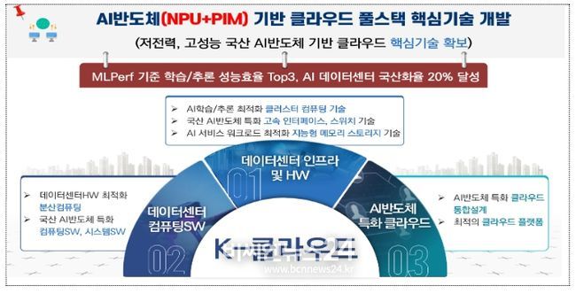 정부는 K-클라우드 기술개발사업에 2025년부터 2030년까지 6년간 총 4031억원(국비 3,426억원)을 투자하여 국산 AI반도체 기반 데이터센터 △인프라 및 HW, △데이터센터 컴퓨팅 SW, △AI반도체 특화 클라우드 기술 등 3개 전략분야 28개 세부과제를 추진할 예정이다. 이를 통해 사업이 종료되는 2030년에는 국산 AI반도체 기반 AI컴퓨팅 학습/추론 성능효율을 글로벌 TOP3 수준으로 강화하고, AI데이터센터 국산화율을 20%로 끌어올리겠다는 계획이다.