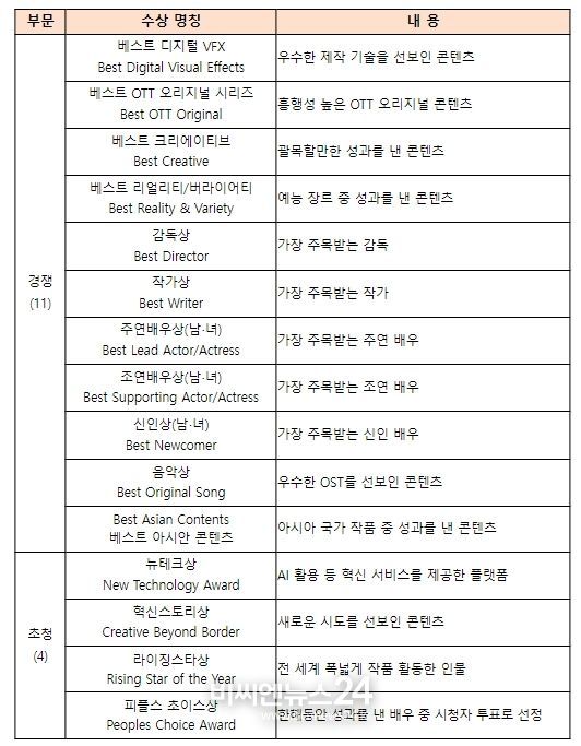 초청 부문은 ▲ AI 활용 등 혁신적 서비스를 제공한 플랫폼에게 수여하는 ‘뉴테크상’, ▲ 새로운 장르와 시도를 선보인 콘텐츠에게 수여하는 ‘혁신스토리상’, ▲ 세계에서 폭넓게 작품 활동을 한 인물에게 수여하는 ‘라이징스타상’, ▲ 한 해 동안 뛰어난 성과를 낸 배우를 대상으로 全 세계 시청자 투표로 선정하는 ‘피플스 초이스상’ 등을 포함한 4개로 구성했다.
