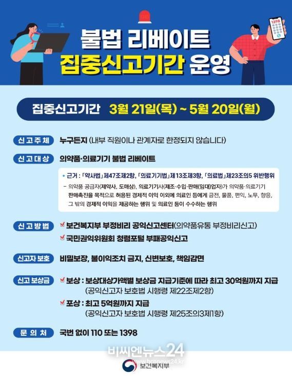(비씨엔뉴스24) 보건복지부는 3월 21일부터 5월 20일까지 2개월간 의약품·의료기기 불법 리베이트 집중신고기간을 운영한다고 밝혔다.