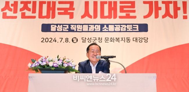 (비씨엔뉴스24) 대구광역시는 7월 8일 오후 3시 달성군청 문화복지동 대강당에서 ‘선진대국 시대로 가자!’라는 주제로 홍준표 대구광역시장과 달성군 직원들과의 소통·공감 시간을 가졌다.