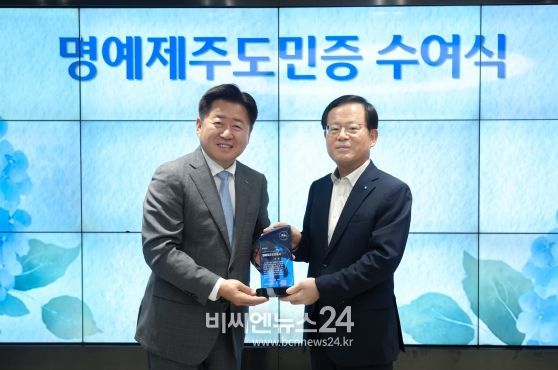 (비씨엔뉴스24) 제주특별자치도는 장기적 경기침체 속에 도내 소기업·소상공인의 경영위기 극복을 위해 적극적인 금융지원을 펼친 조병규 우리은행장에게 명예도민증을 수여했다.