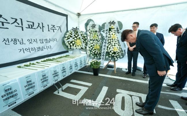(비씨엔뉴스24) 오영훈 제주특별자치도지사는 17일 오후 제주도교육청 주차장에 마련된 서울 서초구 서이초등학교 교사 분향소를 찾아 순직 1주년을 추모했다.