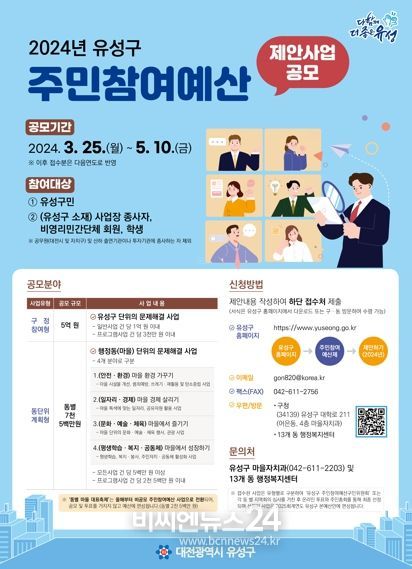 (비씨엔뉴스24) 대전 유성구가 유성구민 등을 대상으로 5월 10일까지 2025년도 예산 편성을 위한 ‘주민참여예산 제안사업’을 공모한다.