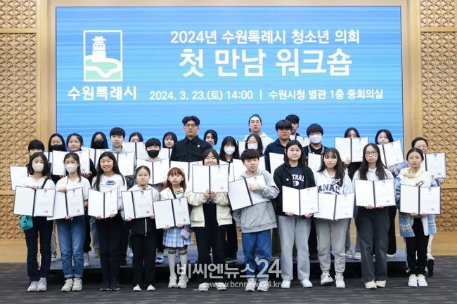 (비씨엔뉴스24) ‘2024년 수원시 청소년의회’ 의원들이 23일 수원시청 중회의실에서 첫 워크숍 ‘우리의 목소리로 수원을 빛나게’를 열었다.
