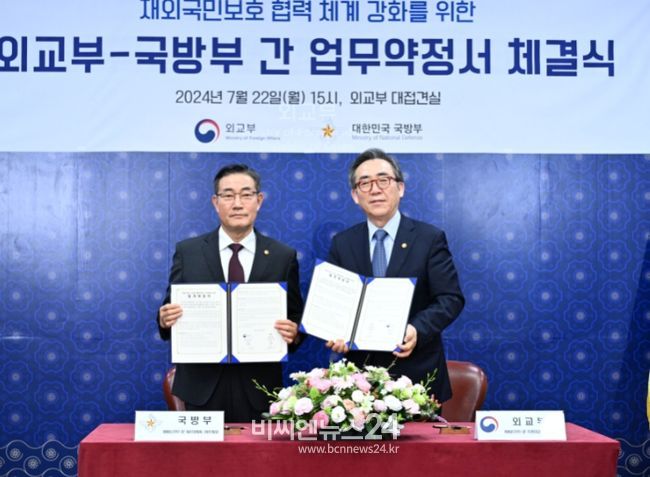 (비씨엔뉴스24) 외교부와 국방부는 7월 22일 오후 외교부 청사에서 '재외국민 보호 협력체계 강화를 위한 외교부·국방부 간 업무약정' 체결식을 개최했다.