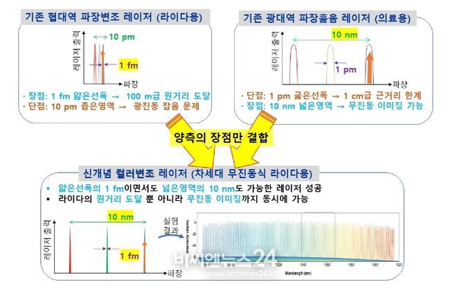 김창석 교수는 가변대역은 좁지만 선폭이 얇아 장거리 신호 감지에 유리한 광통신용 레이저와 감지거리는 짧지만 가변대역이 넓은 의료용 레이저의 장점만을 결합한 독창적 아이디어로 하이브리드 컬러변조 레이저 광원을 설계했다.