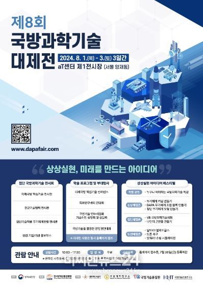 (비씨엔뉴스24) 방위사업청은 “상상실현, 미래를 만드는 아이디어”를 주제로 8월 1일부터 3일까지 서울 양재 aT센터에서 '제8회 국방과학기술 대제전'을 개최하고, 4차 산업혁명 시대의 창의적·도전적 아이디어가 미래에 실현되는 모습을 직접 체험할 수 있도록 다양한 행사를 마련한다고 밝혔다.