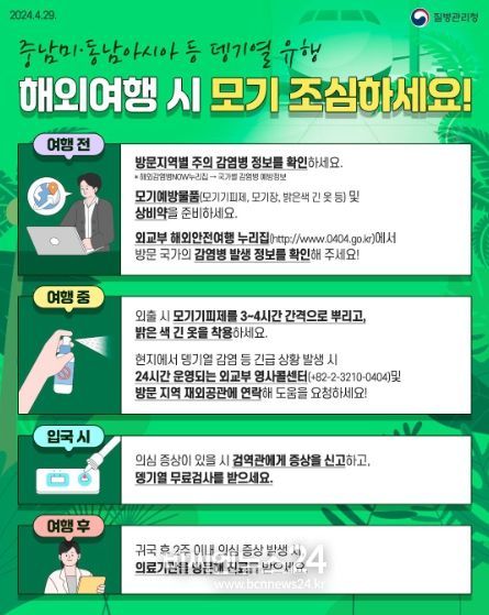 주요 발생지가 태국, 베트남 등 동남아시아 선호 여행지인 만큼 해외여행 시 주의가 필요하다. 뎅기열은 예방백신과 치료제가 없어 모기에 물리지 않는 것이 중요한데 감염되면 5~7일 잠복기를 거쳐 발열과 두통, 오한 등의 증상이 나타난다. 적절히 치료하면 해열 후 대부분 회복하나 일부 중증으로 이어질 수 있다.