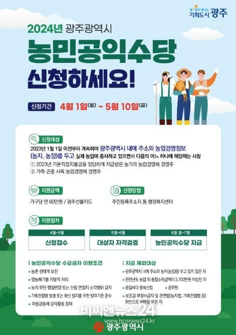 (비씨엔뉴스24) 광주광역시는 4월 1부터 5월 10일까지 주소지 동 행정복지센터에서 ‘2024년 농민공익수당’을 신청받는다.