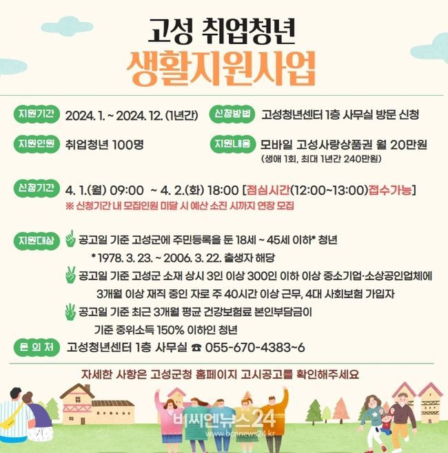 (비씨엔뉴스24) 고성군은 4월 1일부터 2일까지 2일간 ‘2024년 고성 취업 청년 생활 지원 사업’ 참여자 100명을 모집한다고 밝혔다.