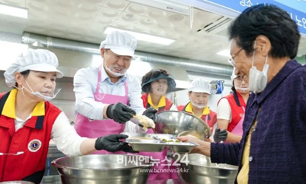 오영훈 지사는 말복을 맞아 어르신 250여 명에게 직접 닭죽을 배식하면서 한 분 한 분의 건강을 챙겼다.