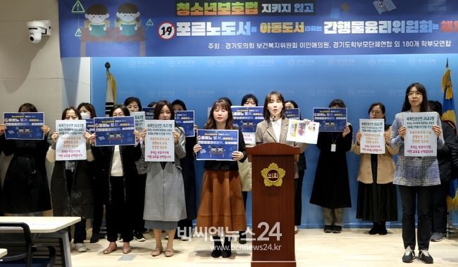 (비씨엔뉴스24) 경기도의회 이인애 의원(보건복지위원회, 국민의힘, 고양2)은 25일 경기도의회 기자회견실에서 경기도학부모단체연합과 전국 17개 지역 71개 학부모 단체와 함께 '부적절 성교육 도서에 대한 간행물윤리위원회 심의 결과'에 대한 규탄 기자회견을 개최했다.
