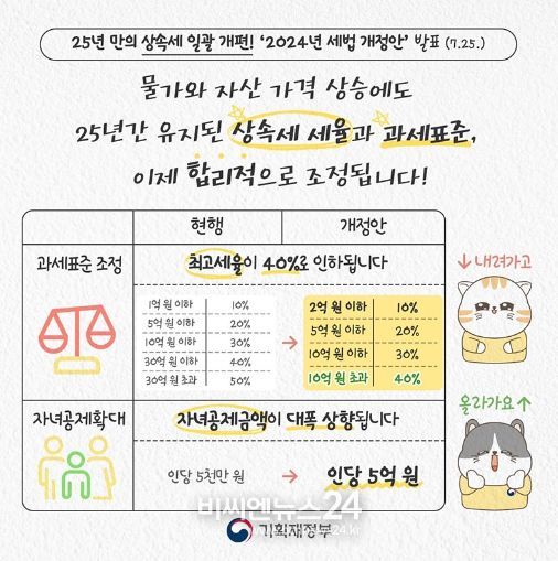 (비씨엔뉴스24) 5년 만의 상속세 일괄 개편! 물가와 자산 가격 상승에도 25년 간 유지된 상속세 세율과 과세표준, 이제 합리적으로 조정됩니다!‘2024년 세법개정안’ 발표(7.25.)Ⅴ 상속세 최고세율 40%로 인하Ⅴ 자녀공제금액 인 당 5억 원으로 대폭 상향정부는 합리적인 조정으로 상속세 부담이 완화될 수 있도록 노력하겠습니다.