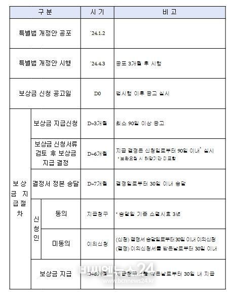 올해 4월 3일부터 「내수면가두리양식업보상법」 및 동법 시행령 개정안이 시행되면, 해양수산부는 보상대상자가 누락되지 않도록 어업인 현장 설명회 등을 통해 보상신청을 적극 안내할 예정이다. 이후 손실보상금 신청공고를 시작으로 보상금 지급 절차를 개시한다.