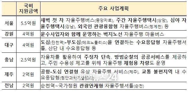 올해 운영비를 지원받는 지자체별 주요 자율주행서비스는 다음과 같다.