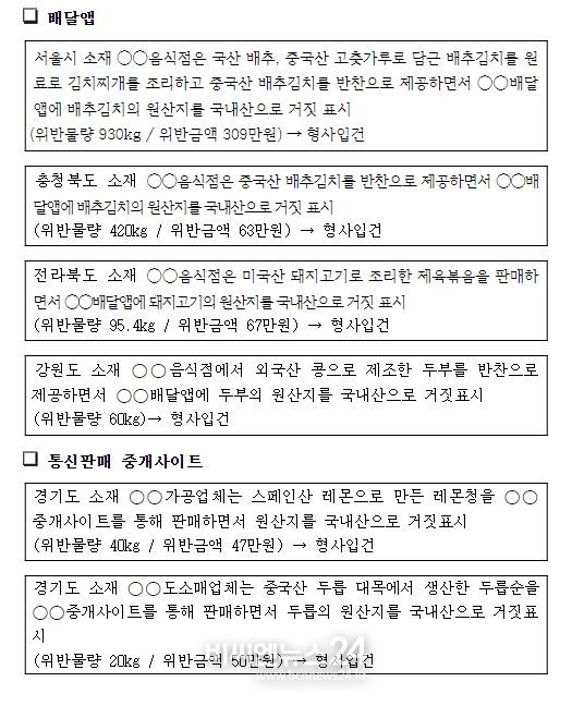 단속 결과, 배달앱에서 원산지 위반 건수는 67개소로 전체의 85.9%이다. 통신판매 중개업체별 위반 순위는 A사(54개소), B사(4개소) 순이며 주요 위반 품목으로는 배추김치(25건), 닭고기(12건), 두부류(11건), 돼지고기(9건) 순으로 나타났다.