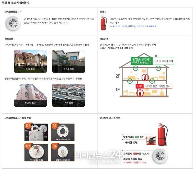 아파트를 제외한 모든 주택에는 주택용 소방시설인 소화기와 단독경보형 감지기를 의무적으로 설치해야 한다. 소화기는 세대별·층별 1개 이상, 단독경보형 감지기는 구획된 실마다 1개 이상 마련해야 한다.