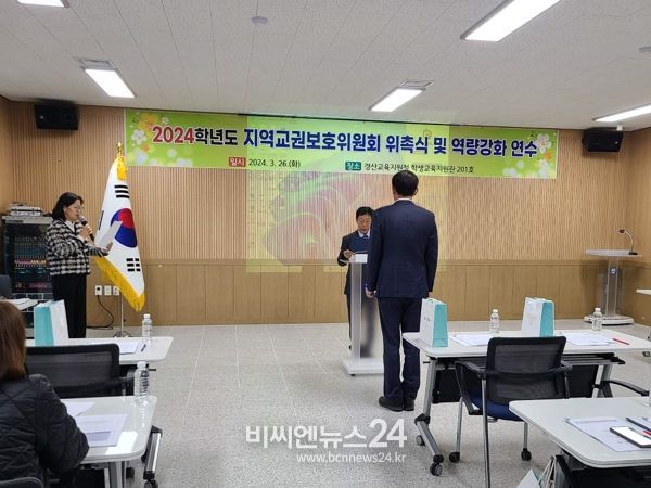 (비씨엔뉴스24) 경상북도경산교육지원청은 교권의 지위 향상 및 교육활동 보호를 위한 특별법이 2024년 3월 28일부터 시행되면서 학교교권보호위원회가 지역교육지원청으로 이관됨에 따라 경산지역교권보호위원회를 구성했고, 지역교권보호위원회 위원을 대상으로 위촉식 및 역량강화 연수를 2024년 3월 26일 경산교육지원청 학생교육지원관 201호에서 실시했다.
