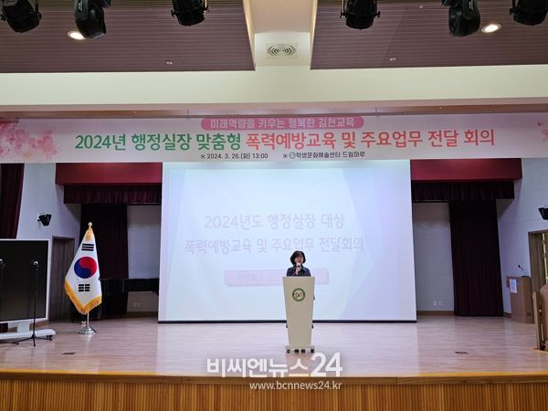 (비씨엔뉴스24) 경상북도김천교육지원청은 2024년 3월 26일 김천학생문화예술센터 드림마루에서 김천 관내 공립 단설유치원, 공‧사립 초‧중‧고등학교 행정실장 55명이 참석한 가운데 폭력예방교육 및 청렴 다짐식, 주요업무 전달회의를 개최했다.