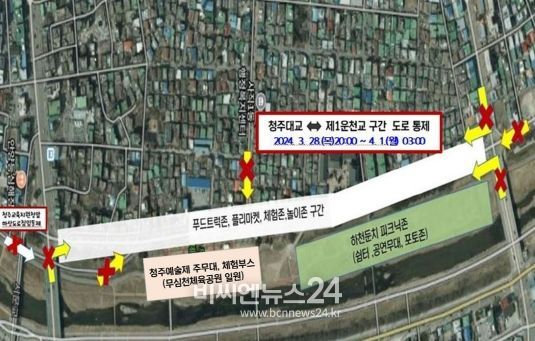 (비씨엔뉴스24) 청주시는 오는 29일 개최 예정인 ‘청주 예술제와 벚꽃 푸드트럭 축제’를 맞아 무심서로 청주대교부터 제1운천교까지 구간의 차량(오토바이, 전동킥보드 포함) 통행을 통제한다고 밝혔다.