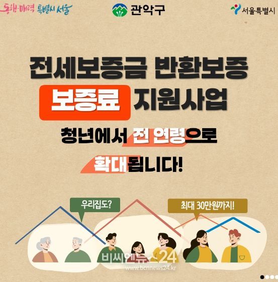 (비씨엔뉴스24) 관악구가 지난해 저소득 청년과 신혼부부를 대상으로 시행한 '전세보증금반환보증 보증료 지원사업'을 올해부터 전 연령대로 확대 추진한다.