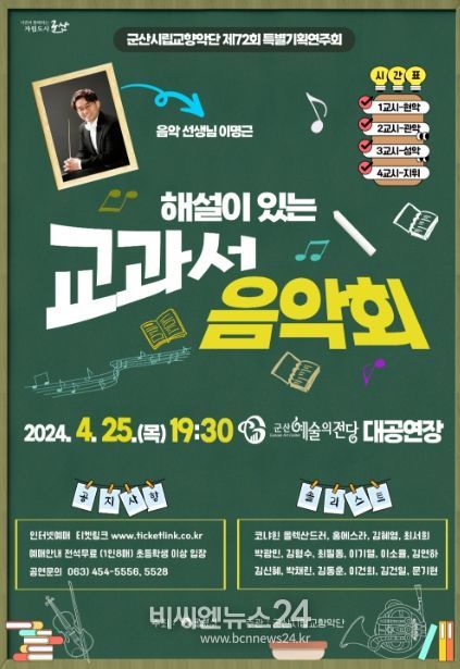(비씨엔뉴스24) 군산시립교향악단이 오는 4월 25일 19시 30분 군산 예술의전당 대공연장에서 제72회 특별기획연주회 ‘해설이 있는 교과서 음악회’를 개최한다.
