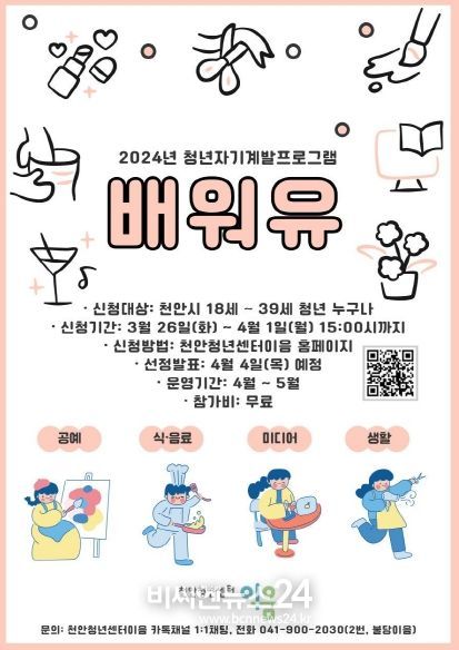 (비씨엔뉴스24) 천안시는 청년센터 이음이 청년 자기계발프로그램 ‘배워유’ 참여자 152명을 모집한다고 27일 밝혔다.