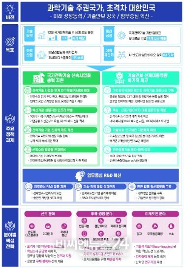 ▲ (목표·기대효과) 제1차 기본계획은 “과학기술 주권국가, 초격차 대한민국”을 목표로 △국가전략기술 신속 사업화 총력 지원, △기술안보 선제대응 역량 획기적 제고, △임무중심 연구개발(R&D) 혁신 등 3대 주요 방향을 설정했다. 이를 통해 현재 12대 국가전략기술 분야 중 세계 선도급 기술을 현재 3개 내외에서 6개까지 높이고, 우리나라의 미래 성장을 이끌 전략기술 기반 거대 신생기업(유니콘) 15개 신규 배출을 추진한다.