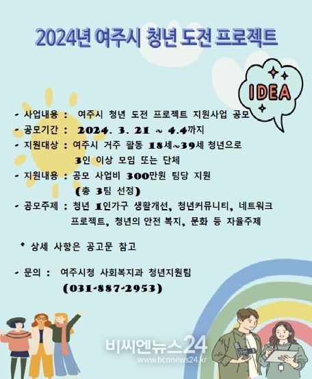 (비씨엔뉴스24) 여주시는 청년층의 다양한 사회적 문제를 주제로 참신한 아이디어와 자율적인 프로젝트를 지원하기 위해 24년 신규사업인 여주시 청년 도전프로젝트를 추진한다고 밝혔다.