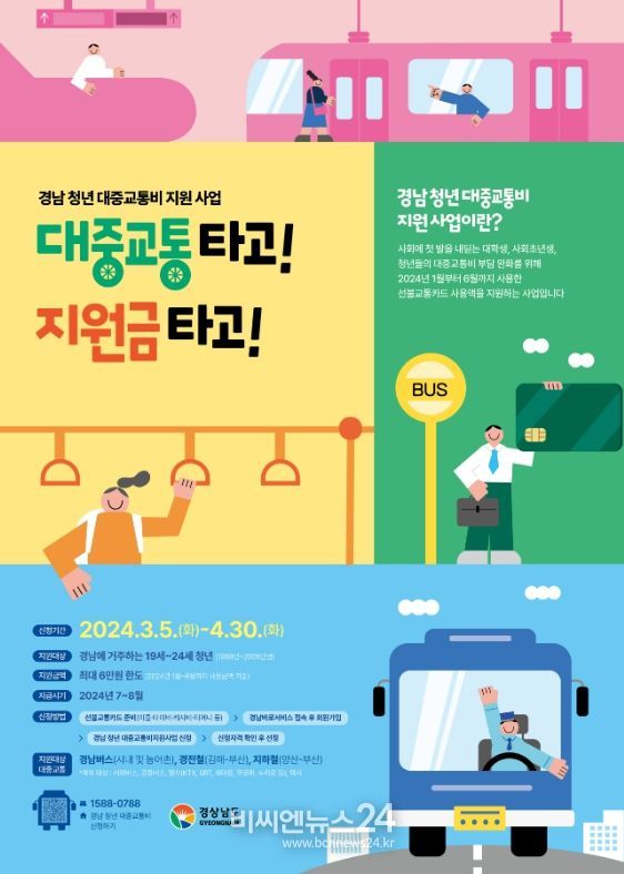 (비씨엔뉴스24) 거제시는 학업·취업 준비 등으로 대중교통 이용이 잦은 청년들의 경제적 부담을 덜어주기 위해 '2024년 경남 청년 대중교통비 지원 사업'을 시행한다고 밝혔다.