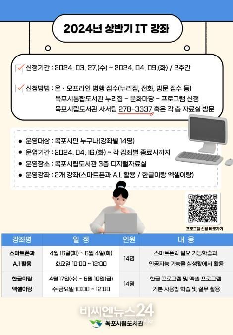 (비씨엔뉴스24) 목포시립도서관은 디지털 환경 변화에 발맞추어 2024년 상반기 IT 강좌를 목포시민과 인근 지역민을 대상으로 4월부터 운영한다고 밝혔다.