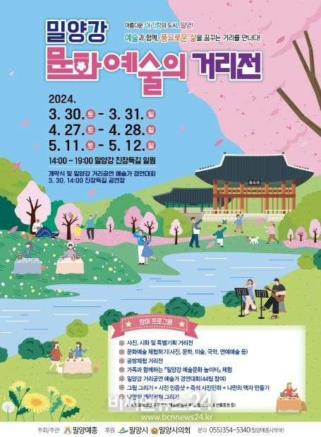 (비씨엔뉴스24) (사)한국예술문화단체총연합회 밀양지회가 주관하는‘2024년 밀양강 문화예술의 거리전’이 오는 30일 오후 2시 밀양강 진장 둑길 남천강변로 일원에서 펼쳐진다.