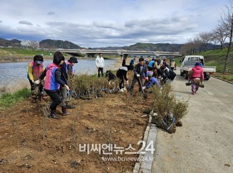 협약 후, 5개 단체 회원 60여 명과 읍사무소 직원들이 합심하여 서천변 일원에서 ‘철쭉심기 행사’를 진행해 면적 860㎡에 철쭉 1,500여 그루를 심었다.