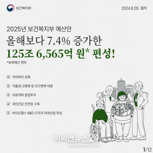 (비씨엔뉴스24) 2025년 보건복지부 예산안이 올해보다 7.4% 증가한