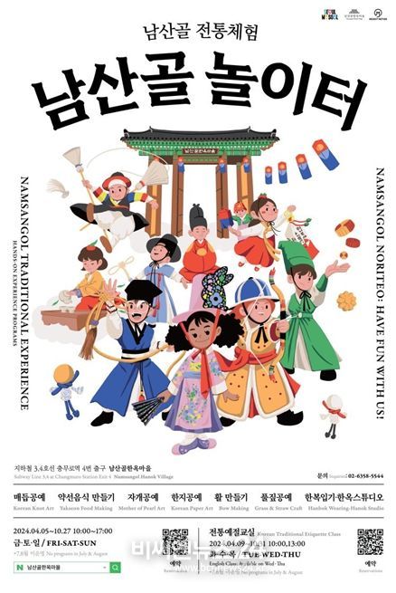 한편, '남산골 놀이터'의 체험프로그램은 ▴매듭공예 ▴약선음식만들기 ▴자개공예 ▴한지공예 ▴활만들기 ▴풀짚공예 ▴한복입기 ▴한옥스튜디오를 마련했다. 매주 금~일 진행하며, 7~8월 혹서기에는 쉬어간다. 각 프로그램 체험비는 8,000원~30,000원까지 체험별로 상이하다.