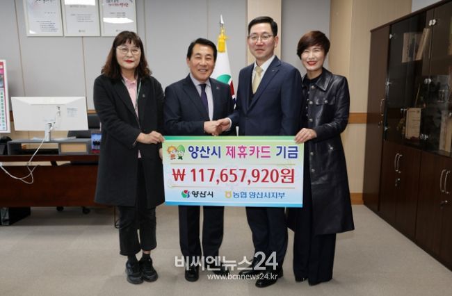 (비씨엔뉴스24) 양산시는 2023년 제휴카드 기금 1억1천766만원을 NH농협은행 양산시지부(지부장 김원묵)로부터 전달받았다.