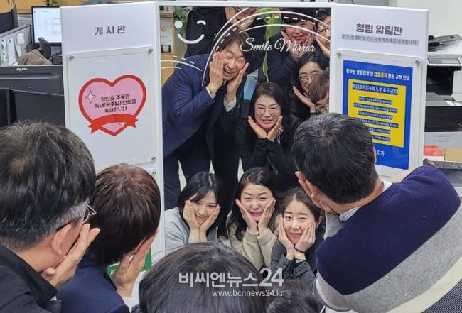 스마일 거울은 하트모양 디자인이 색인 되어 전신을 비추는 거울로써 직원들과 사무실을 방문하는 민원인이 본인의 모습을 비추었을 때 웃는 표정을 유도하여 항상 밝고 친절한 사무실 분위기를 조성하기 위해 설치됐다.