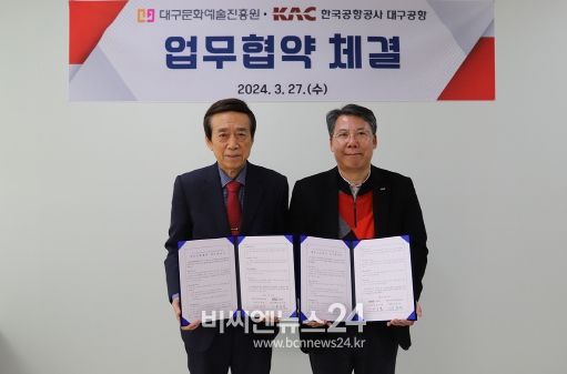 (비씨엔뉴스24) (재)대구문화예술진흥원은 27일 한국공항공사 대구공항과 지역 문화예술 확산 및 지역관광 활성화를 위한 업무 협약식을 개최했다.