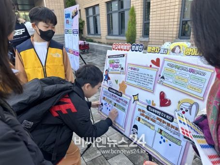 ‘친구를 돕는 멋진 일, 학교폭력 방어자’를 주제로 한 학교폭력예방 캠페인은 학교폭력 발생 시 방관자가 아닌 방어자가 되자는 서명운동과 학교폭력 예방퀴즈, 학교폭력 방어자 구호 외치기 등 다양한 참여 활동이 펼쳐졌다.