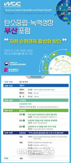 (비씨엔뉴스24) 부산시는 대통령직속 2050탄소중립녹색성장위원회와 오늘(4일) 오후 2시 벡스코 컨벤션홀에서 '자원 순환경제 활성화 방안'을 주제로 '탄소중립·녹색성장 부산 포럼'을 개최한다고 밝혔다.