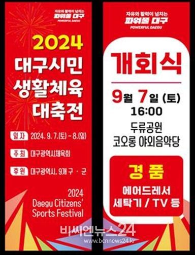 (비씨엔뉴스24) 대구지역 생활체육 동호인들의 우정과 화합의 축제(6,000여 명 참여)인 ‘2024 대구시민생활체육대축전’이 9월 7일 코오롱 야외음악당에서 개회식을 시작으로 이틀간 대구 각지의 15개 경기장에서 개최된다.