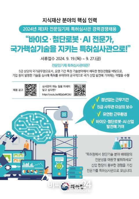 (비씨엔뉴스24) 특허청은 국가전략기술 분야 우리 기업의 특허 경쟁력 강화를 위해 바이오(35명), 첨단로봇(16명), 인공지능(9명) 등 세 분야에서 총 60명의 전문임기제 특허심사관(5급상당)을 채용한다고 밝혔다. 앞서 특허심사관 채용을 완료한 반도체, 이차전지 분야에 이어 바이오·첨단로봇·인공지능 분야에서도 우리 기업의 빠른 특허 확보가 가능해질 것으로 기대된다.